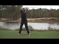 Now, to start your downswing, try to plant your lead heel back on the ground AND swing your arms down without bending your trailing elbow AT THE SAME TIME. Basically, it feels as if you're just holding your arms in the same position while you pivot them down from your shoulder joints. It's like a karate chop with both hands. IF YOU BEND YOUR TRAILING ELBOW EVEN MORE AS YOU START DOWN, YOU'RE DOING IT WRONG!